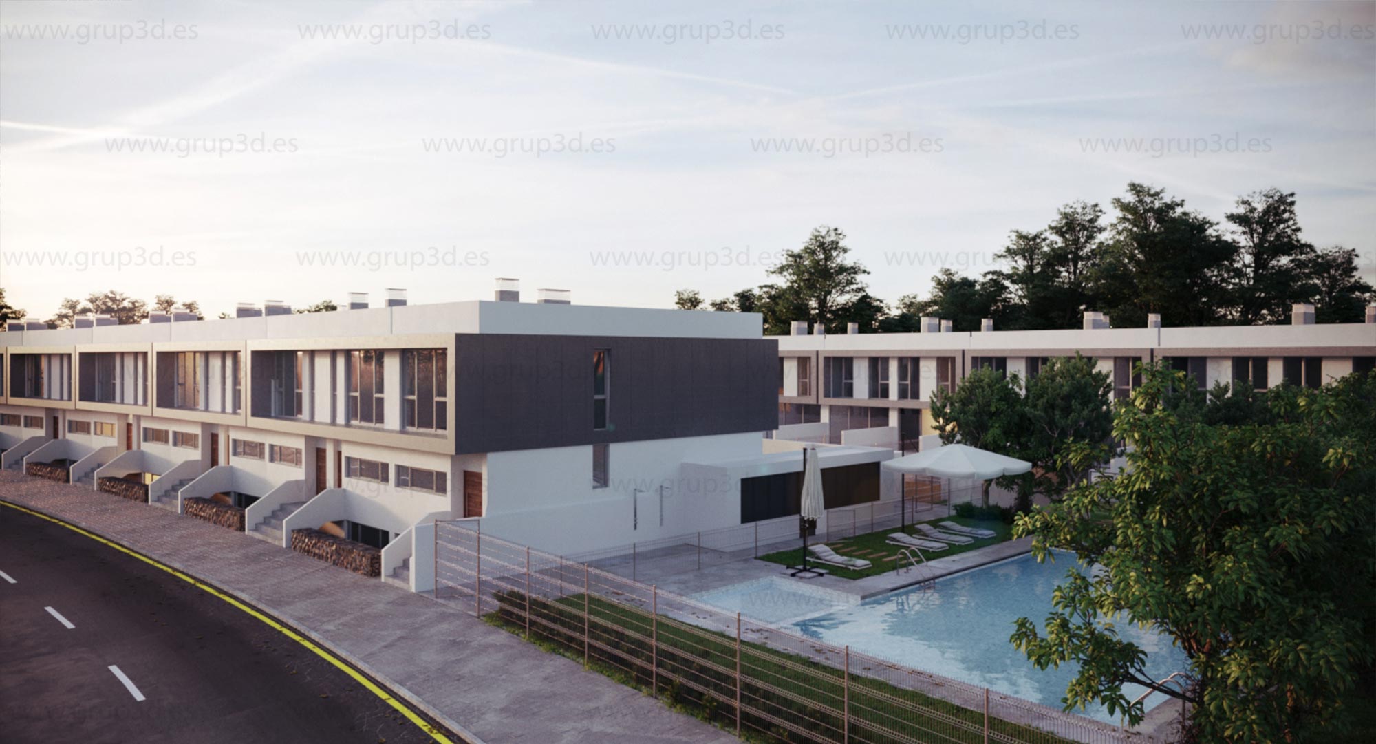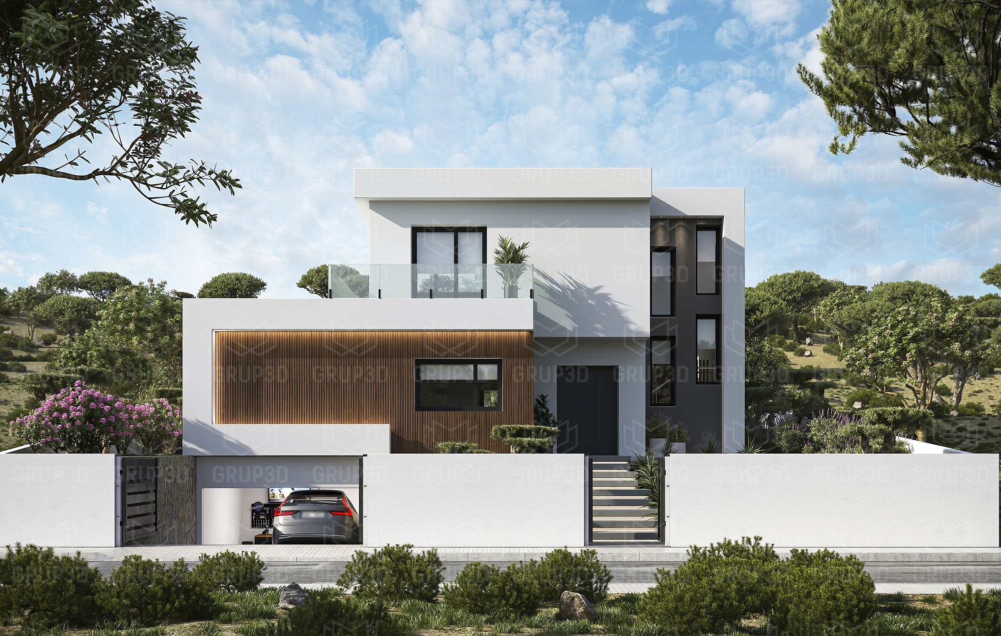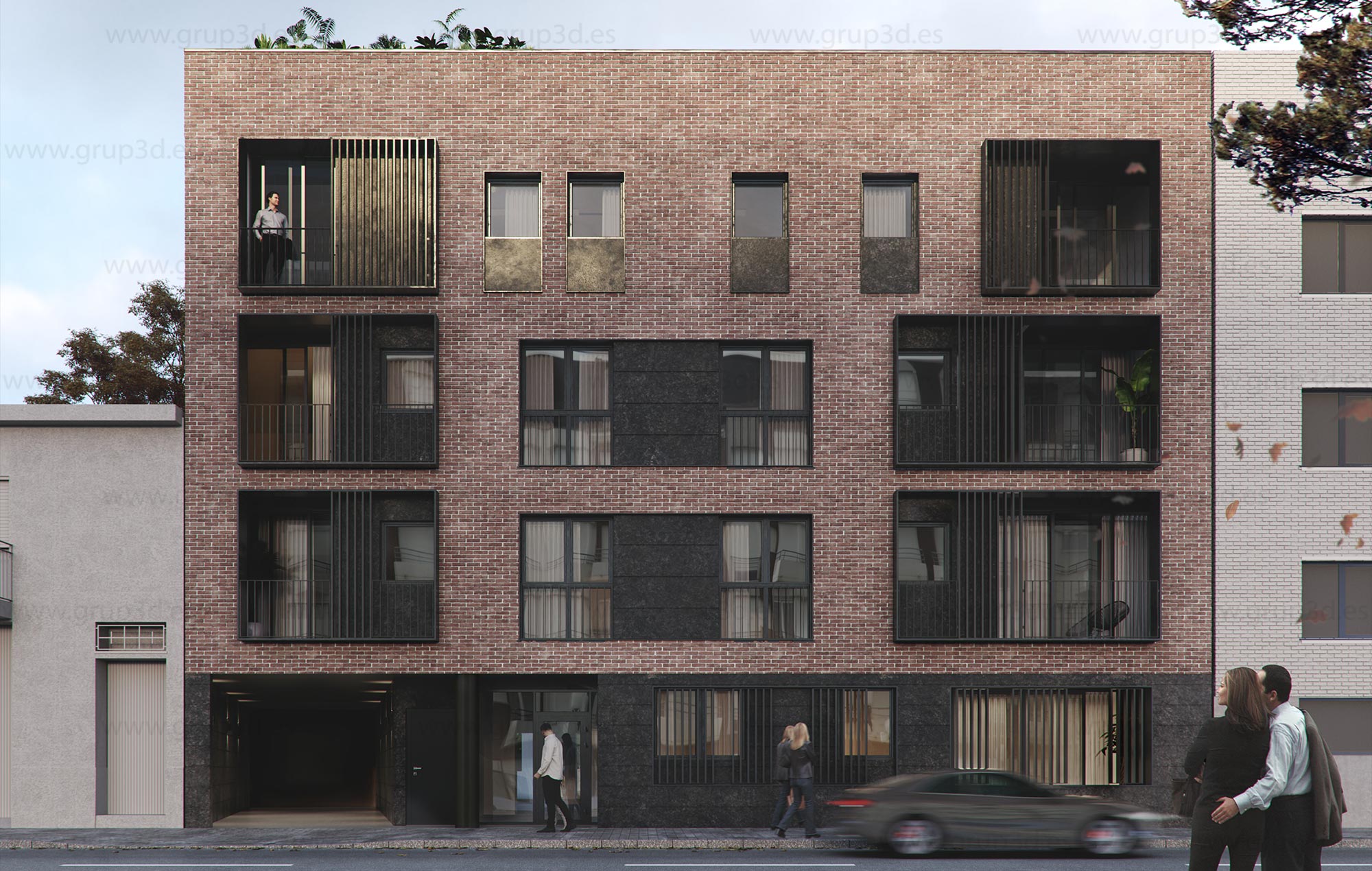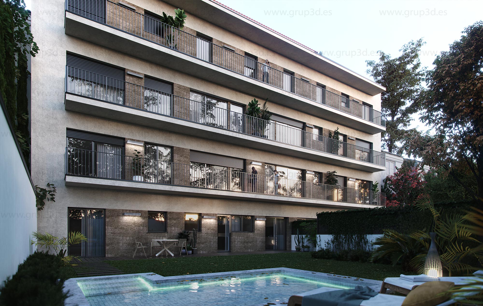 Este tipo de render se enfoca en mostrar la fachada del edificio desde diferentes ángulos y perspectivas. Puede resaltar detalles arquitectónicos, materiales, texturas y elementos de diseño.